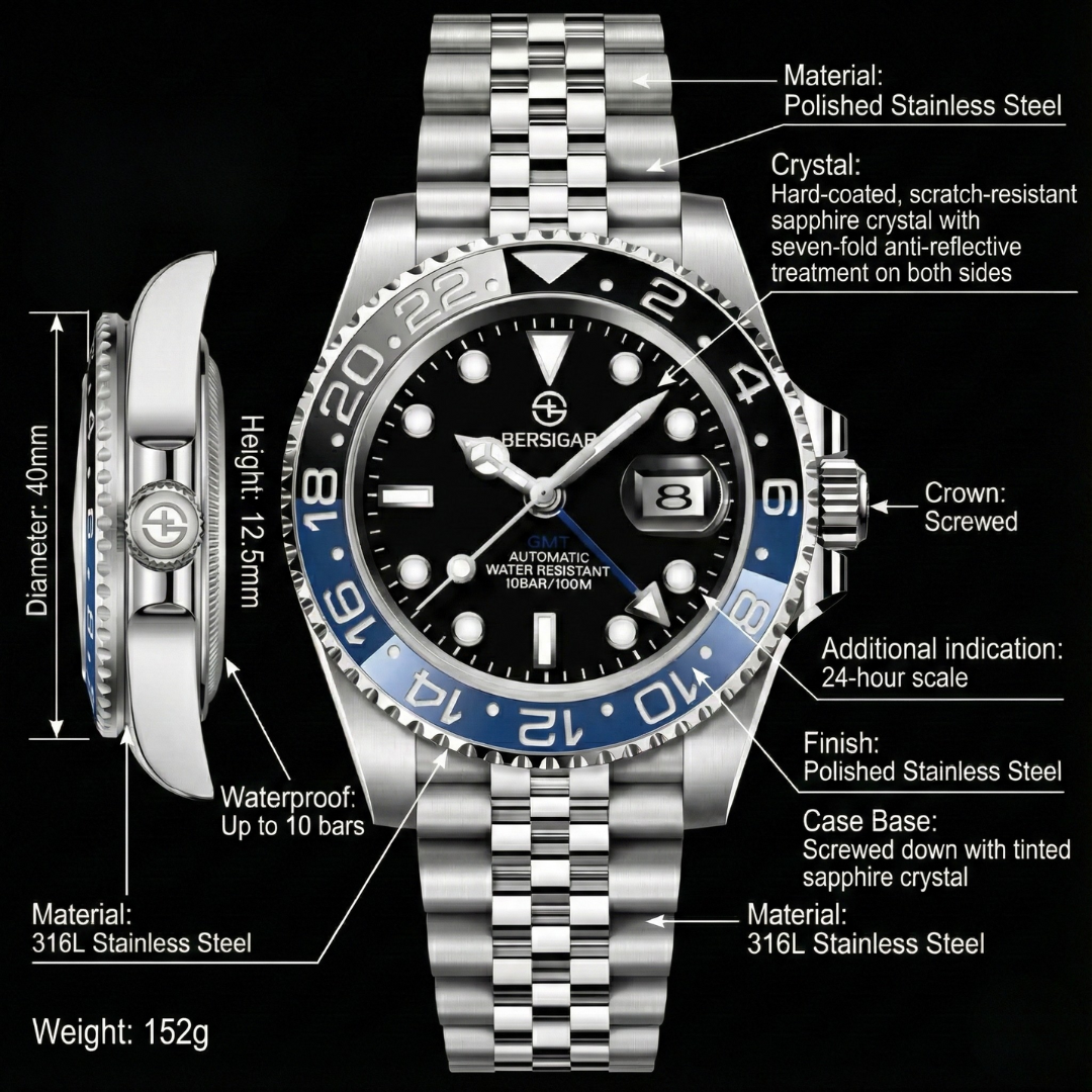 Top-quality Pearl DG5833 GMT automatic movement, very accurate timekeeping, self-winding and the power of the spring can reserve more than 36 hours.