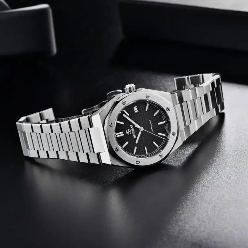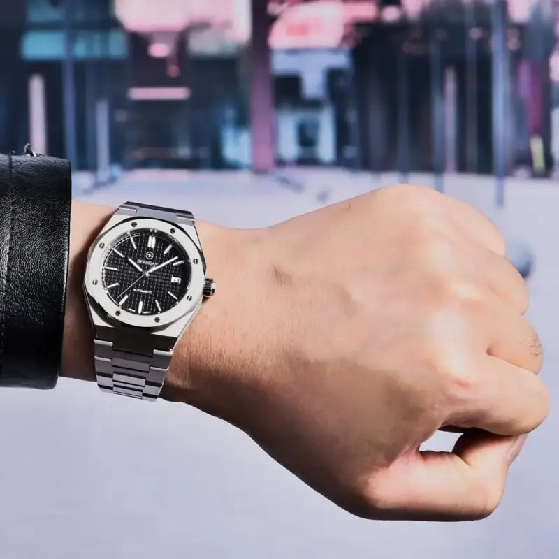 Premium materials and casual design, Sapphire dial window, full 316L stainless steel construction with screw-down crown, transparent case back, solid and flexible watchband with classic fold-over clasp.