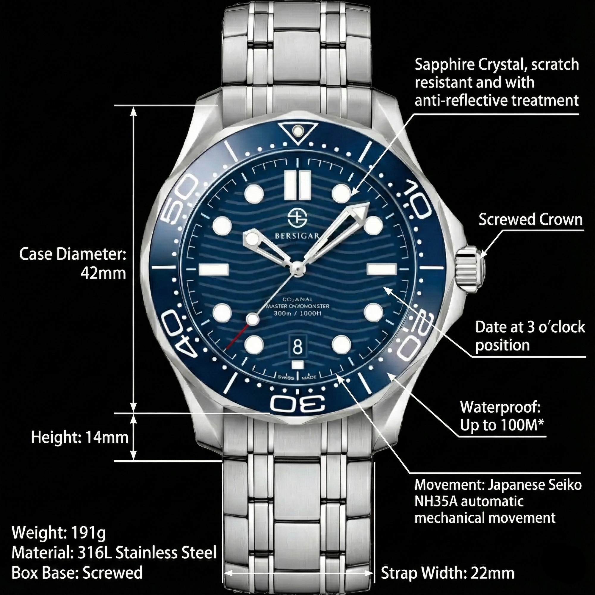 Water resistant to 100 m (330 ft), In general, suitable for professional marine activity and serious surface water sports, but not scuba diving, The crown would need to be pushed in and then screwed down in order to protect the watch from water damage