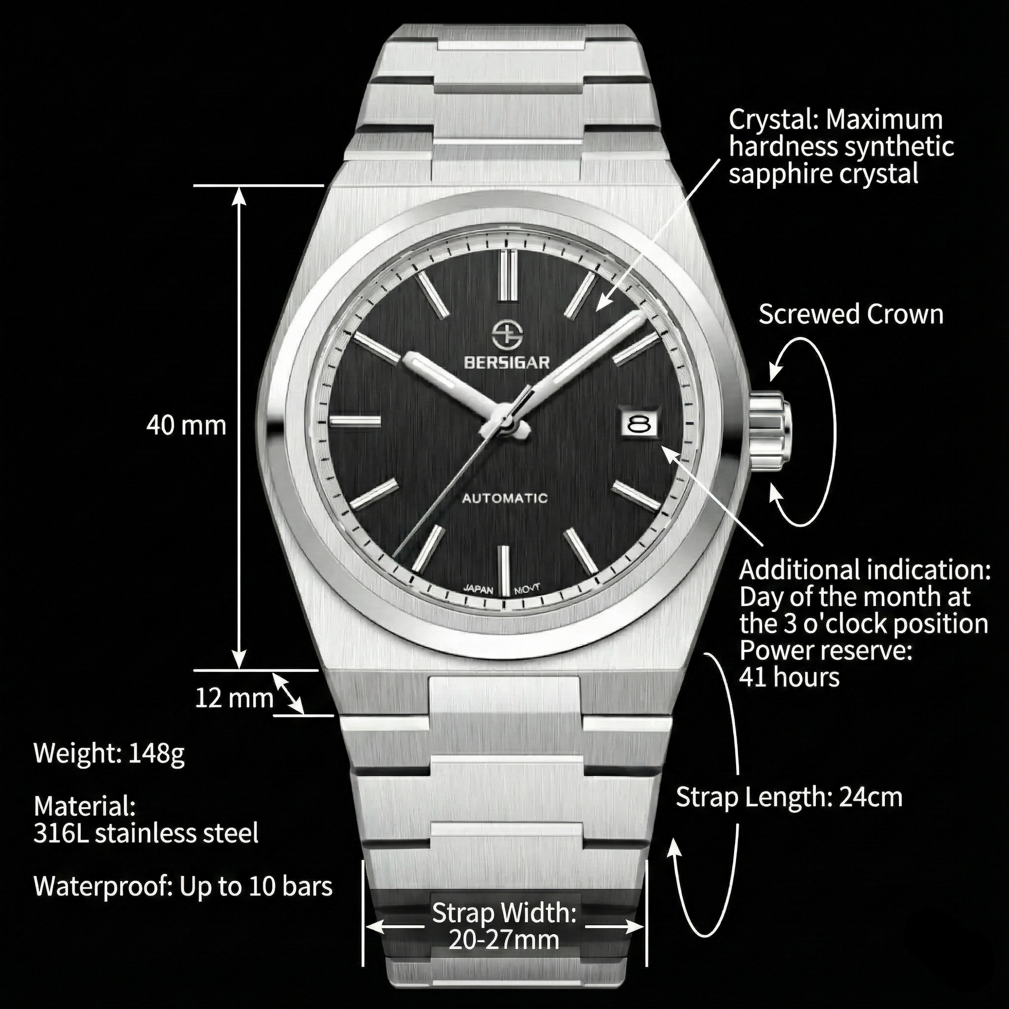 Water resistant to 100 m (330 ft), In general, suitable for professional marine activity and serious surface water sports, but not scuba diving, The crown would need to be pushed in and then screwed down in order to protect the watch from water damage