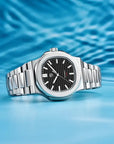 Premium materials and casual design, Sapphire dial window, stainless steel construction with screw-down crown, and solid case back, solid and flexible watchband with classic fold-over clasp.