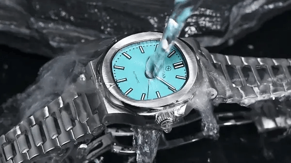 Water resistant to 100 m (330 ft), In general, suitable for professional marine activity and serious surface water sports, but not scuba diving, The crown would need to be pushed in and then screwed down in order to protect the watch from water damage
