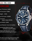 Premium materials and casual design,Sapphiredial window, full stainless steel construction withscrew-downcrown, theceramic bezelcan be rotated counterclockwise and transparent case back, solid and flexible watchband with classic fold-over clasp, or genuine leather watchband with buckle.