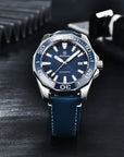 Premium materials and casual design,Sapphiredial window, full stainless steel construction withscrew-downcrown, theceramic bezelcan be rotated counterclockwise and transparent case back, solid and flexible watchband with classic fold-over clasp, or genuine leather watchband with buckle.