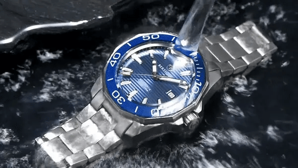 Water resistant to 100 m (330 ft), In general, suitable for professional marine activity and serious surface water sports, but not scuba diving, The crown would need to be pushed in and then screwed down in order to protect the watch from water damage